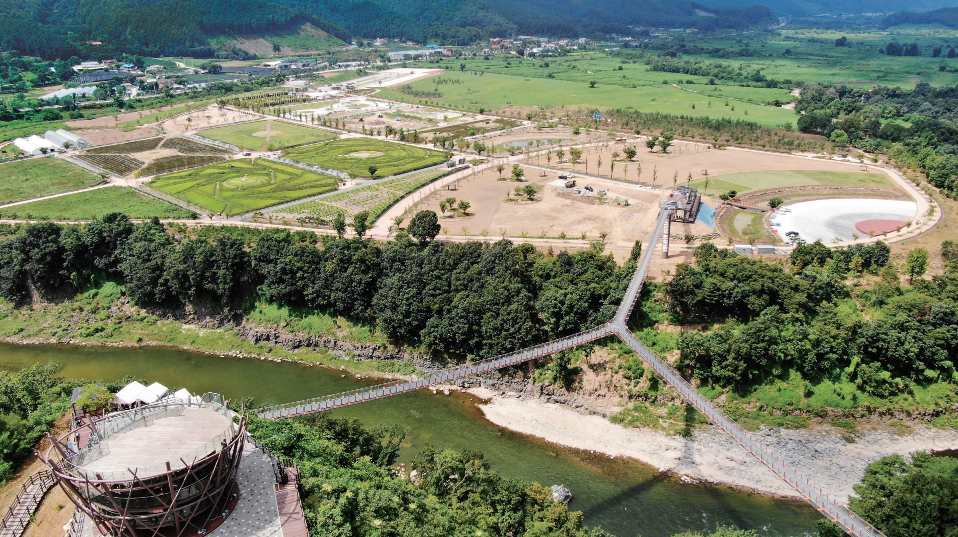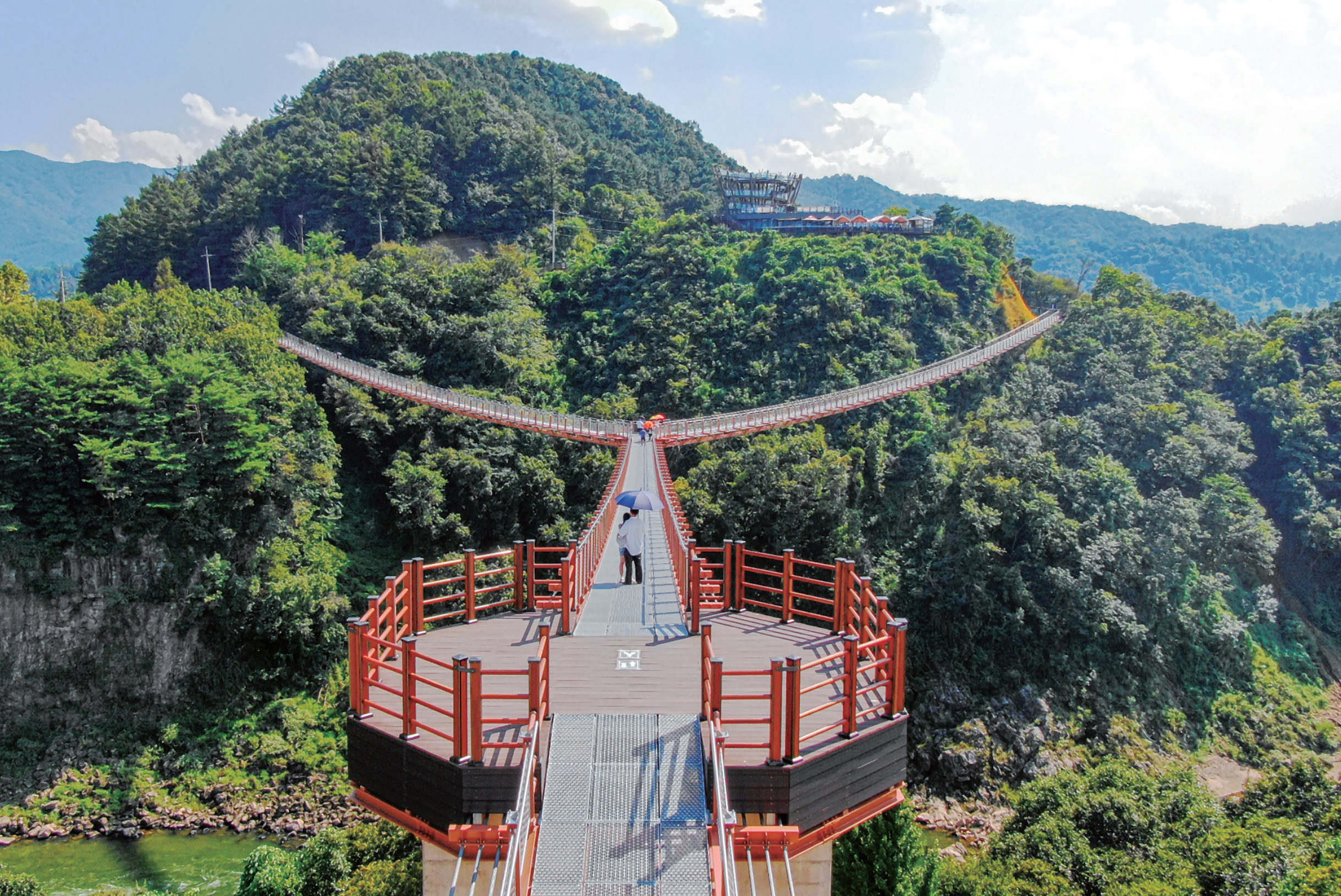 한탄강 Y자 출렁다리. 2024년 9월 개장한 국내 최장 410m Y자형 출렁다리로, 국제교량구조공학회(IABSE) 우수구조물상을 수상했다. 포천 한탄강 세계드론제전 기간에는 다리 위와 협곡을 가로지르는 드론레이싱과 라이트쇼가 펼쳐져, 방문객들에게 한층 짜릿한 경험과 장관을 선사할 예정이다.