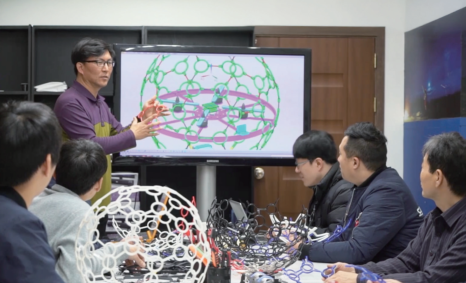 캠틱의 개발자들은 1000여 개의 부품이 들어가는 자동화 설비도 설계해서 제작할 정도의 능력을 지녔다. 그런 개발자들이 가장 심혈을 기울인 부분이 드론을 감쌀 펜타가드의 재질이다. 본래 드론은 임무수행을 위해 장애물을 피하는 기능이 가장 중요한 기본기능인데, 이와 반대로 드론축구볼은 상대방 볼과 격렬히(약 1톤에 가깝게) 부딪히면서 임무수행(공수 및 득점)을 해야 하기 때문에 펜타가드는 단단하면서도 탄성이 있는 재질을 써야 한다.