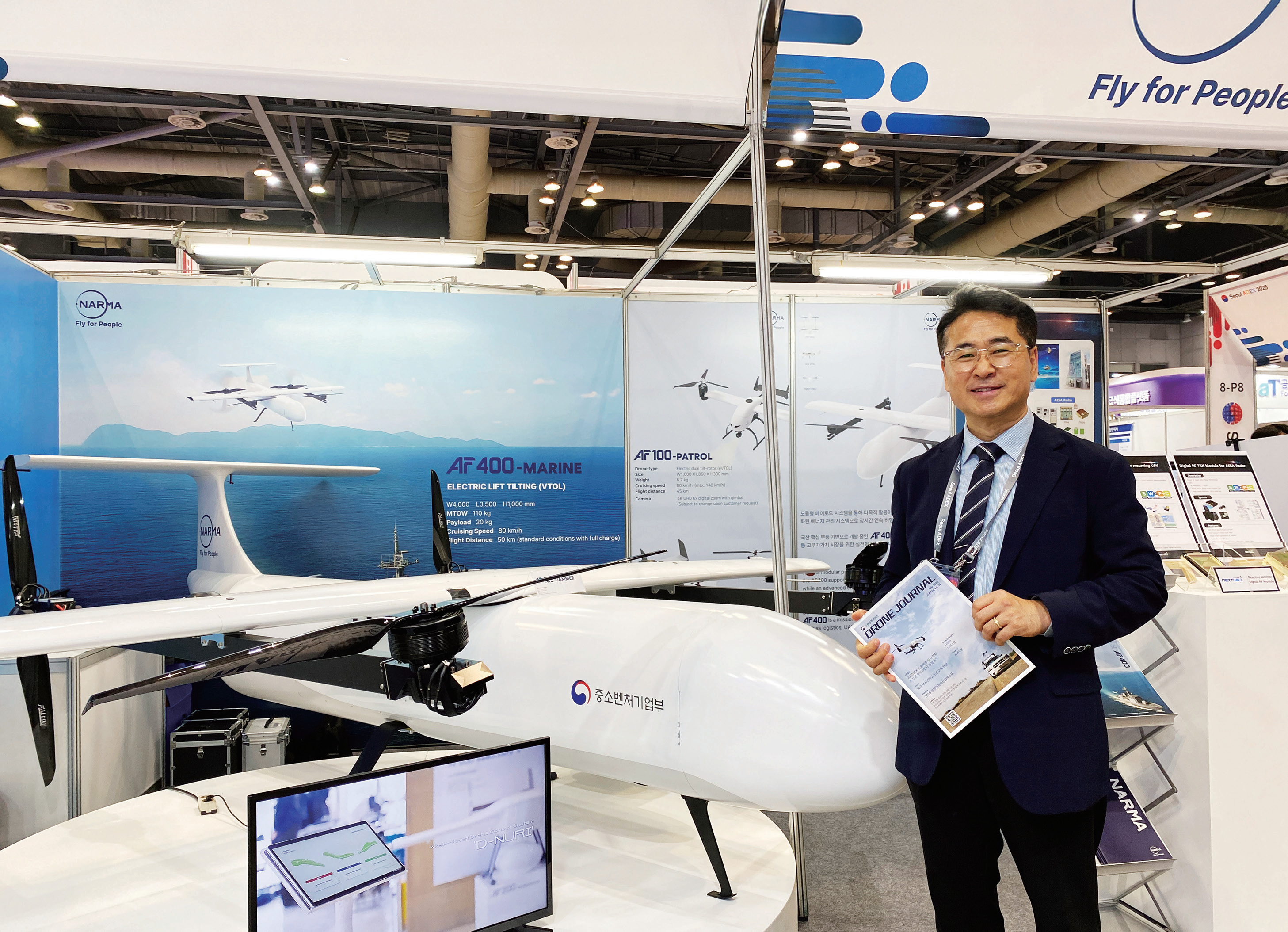 나르마 권기정 대표가 AF400를 첫 공개한 ADEX 2025 현장에서 드론저널을 들고 포즈를 취하고 있다.